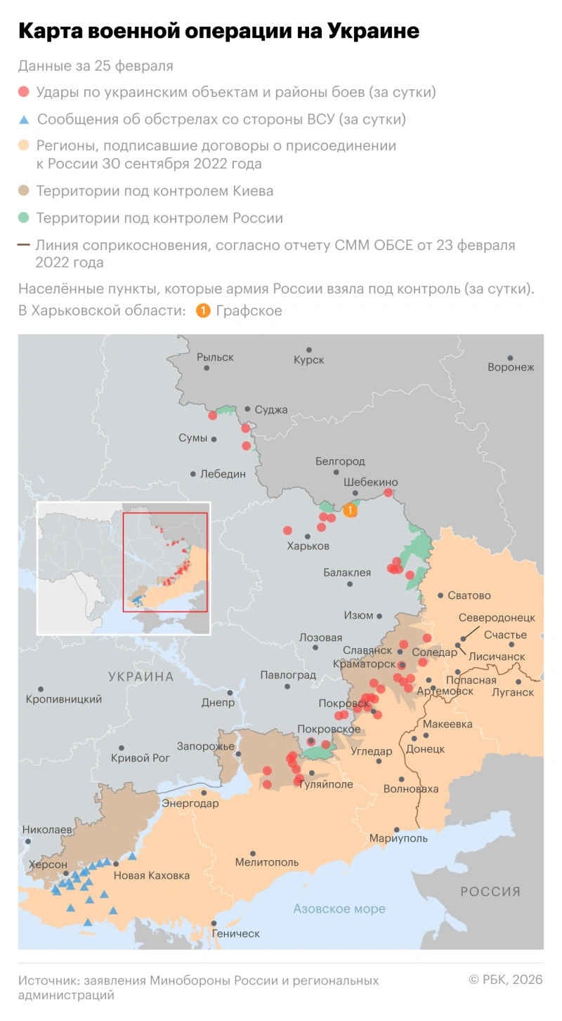 Минобороны сообщило, что после занятия населенного пункта Графское в Харьковской области подразделения группировки «Север» продолжили расширять зону безопасности в приграничных районах Сумской и Харьковской областей. «Установление контроля над населенным пунктом открыло возможность дальнейшего наступления на юг вдоль реки Северский Донец», — говорится в сообщении.